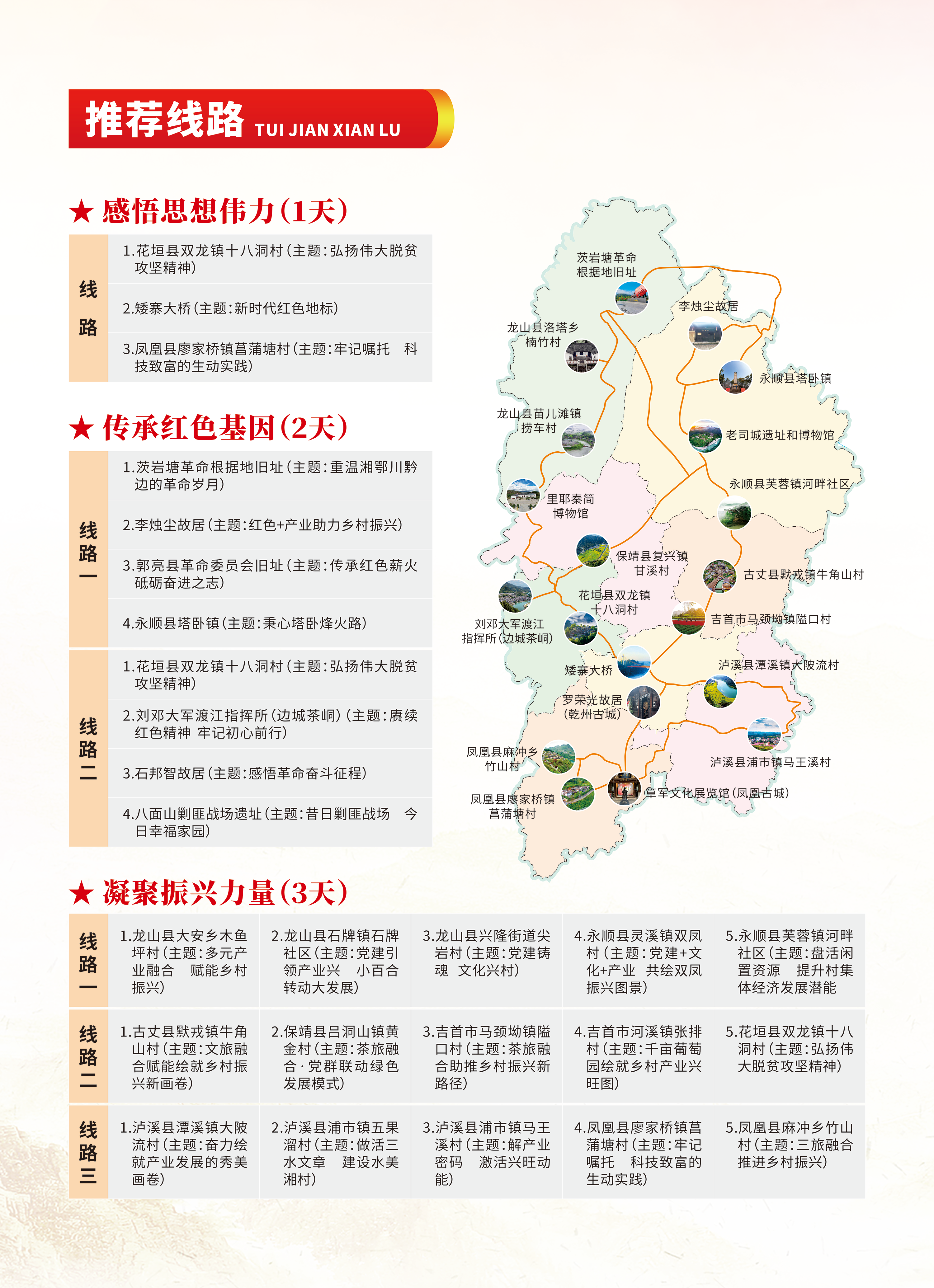湘西⾃治州坚持全州⼀盘棋,深⼊挖掘丰富的红⾊、历史、⽂化等资源,以三个省级党员教育⽰范基地和两个省级党员教育现场教学点为⽀撑,布局特⾊鲜明的州级现场教学点31个,积极探索打造全⽅位、多维度、⽴体式党员教育教学阵地;整合州县两级资源,建⽴州级党员教育培训师资库118⼈,开发精品党课110个,打磨观摩式、体验式、情景式等现场教学课76个,推进全州党员教育阵地、师资、课件等要素互联互动、共建共享,建设全州党员教育矩阵。